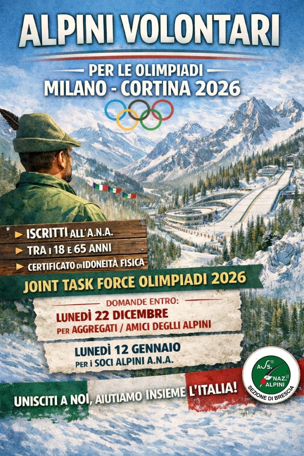 L'Associazione nazionale Alpini sta cercando 1000 volontari, tra Alpini ed Aggregati, maggiorenni, ma di età non superiore ai 65 anni, al fine di fornire supporto all'organizzazione delle Olimpiadi. Cliccare sull'immagine per ulteriori informazioni.